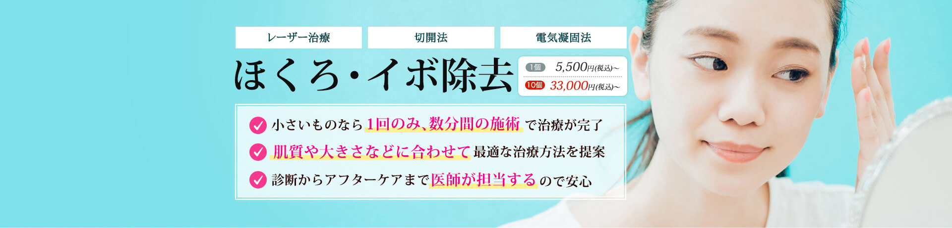 ほくろ、イボには、大きさ・形状など様々なタイプがあり、主に、盛り上がりのあるもの、扁平なもの、色の濃い・薄いタイプのものなどがあります。子供の頃から、大きさも色の濃さも変わらない場合もあれば、気付いたら知らない間に出来ていたというケースもよくあります。場合によっては、年単位で少しずつ大きくなるケースもありますので、気になるものがあれば、早目に処置した方が良いでしょう。お顔や身体まで、わずか数分の処置で簡単に除去する事が可能です。なお、除去には3種類の方法がありますのでご紹介します。